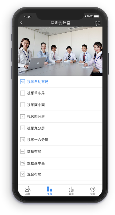 在手機app 上可對會議的權限、布局進行控制,簡單方便的遠程協作體驗。